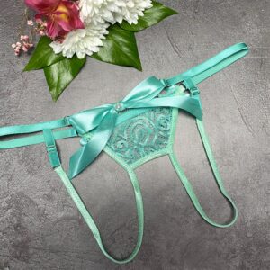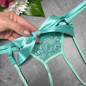 Materials: delicate sheer lace, silk bow, adjustable straps, elastic