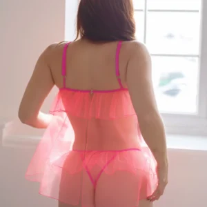 The pink transparent babydoll with ruche is a delicate and feminine lingerie piece designed to flatter and enhance your figure. Its sheer fabric in a charming shade of pink adds a playful and alluring touch, while the ruche detailing creates a textured and stylish look. This babydoll is perfect for those who want to feel confident and romantic, combining comfort with a touch of sensuality.