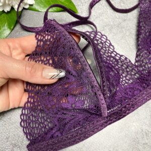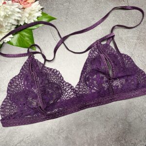 Materials: delicate embroidered lace, adjustable straps, metal hardware, elastic