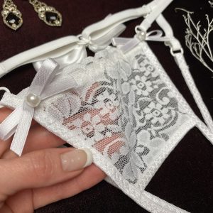 Materials: delicate sheer lace, adjustable straps, silk bow, pearls
