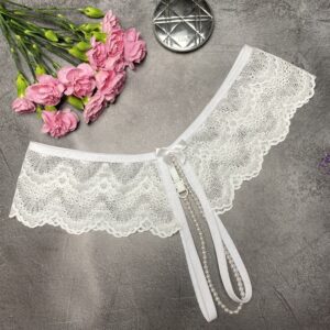 These gorgeous crotchless panties are made of delicate sheer lace and decorated with pearls and silk bow.